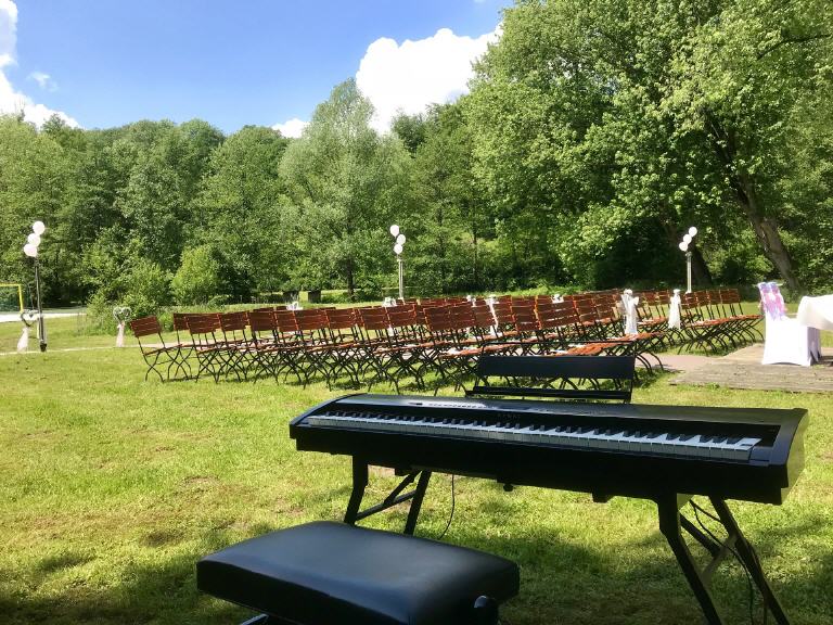 Bei größeren Gesellschaften oder bei besonders feierlichen Hochzeiten besteht auch die Möglichkeit ein "richtiges" Klavier oder einen Flügel anliefern lassen. Das ist gar nicht so teuer wie Sie jetzt vielleicht denken. Ich arbeite seit über 10 Jahren mit einem Klavierbauer zusammen, der mir regelmäßig Klaviere landesweit zu Hochzeiten oder Veranstaltungen liefert.